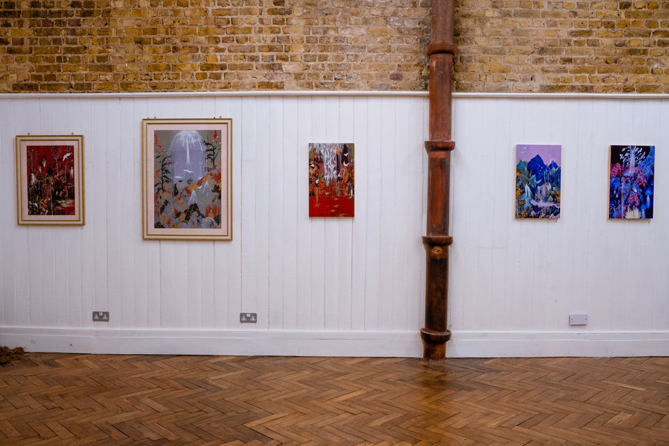 Apparitions not only refers to the ghostly figures and birds within Suhaylah’s paintings, but the mystical environments they inhabit. Existence flourishes in the space between the spiritual and the corporeal, anchored in naturalistic scenes laden with merging trees, pools, brush and waterfalls. Her vastly changing palettes, spectral figures and leading titles conjure the cycles ever-present within her harmonious renditions of natural order.