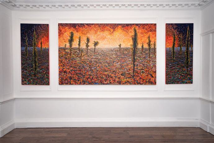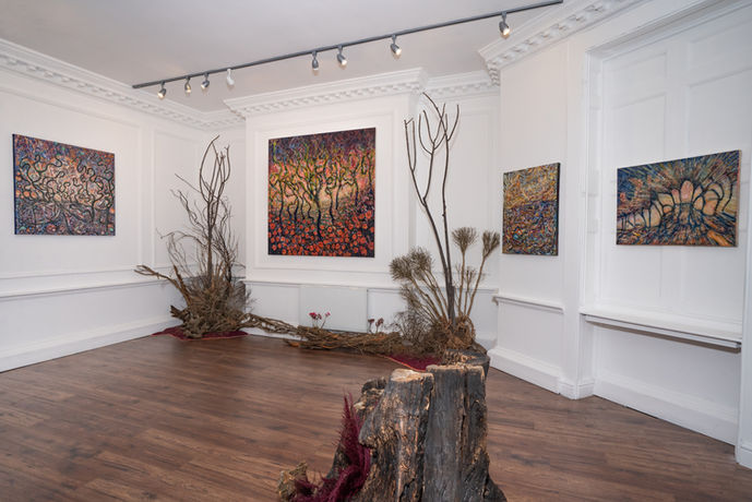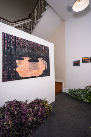 Through making landscape paintings, Grieve finds himself engaging in reveries and nostalgia from remembered landscapes and experiences. They reference actual places merging poetic rural ideals, sometimes underpinned with fragments and marks from urban angles and the sound of the city. In bringing together these elements, Grieve celebrates the unique qualities of painting, constructing illusory spaces through mark-making and strokes of colour.