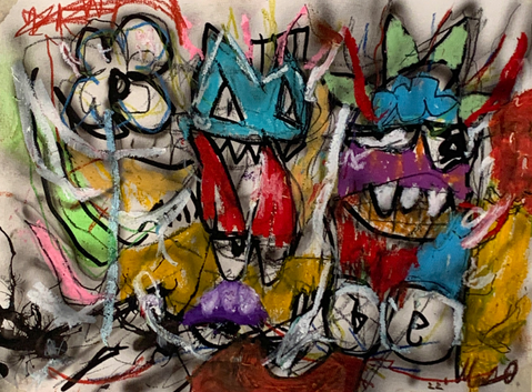 Frantic energy predicated on a desire for energy exchange between painter and viewer, liberal use of colour and crowded space, are signatures of Orlando Marosini’s mixed media works. Inspired by modern artists such as Jean-Michel Basquiat, George Condo, and Basquiat’s own inspiration, Willem de Kooning, symbolism and abstraction are ever present components of Marosini’s art. The almost tangibly familiar aspects of the unknown are of particular interest to the artist, whose excitement at the possibility of illustrating these parallels directly impacts his inclination to use characters as vehicles for emotions.