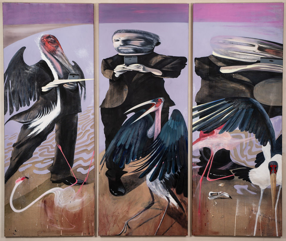 The artwork presented in multi-award-winning artist James Dearlove‘s solo exhibition Tales of the City, Tales of the Sea at BWG Gallery, includes paintings from the last 2 years installed throughout the gallery’s 3 rooms. In these paintings Dearlove imagines the contemporary human experience, issues of modern society and his own personal journey, using depictions of human bodies, many of whom are heaped together and set adrift in urban or rural landscapes, that are haunted by animals and therianthropic beings composed of human and animal body parts. There is a strong sense of the uncanny experienced within Dearlove’s paintings, his presentation of twilit realms at once feeling both familiar and unsettling, emanating both desire and disquietude.