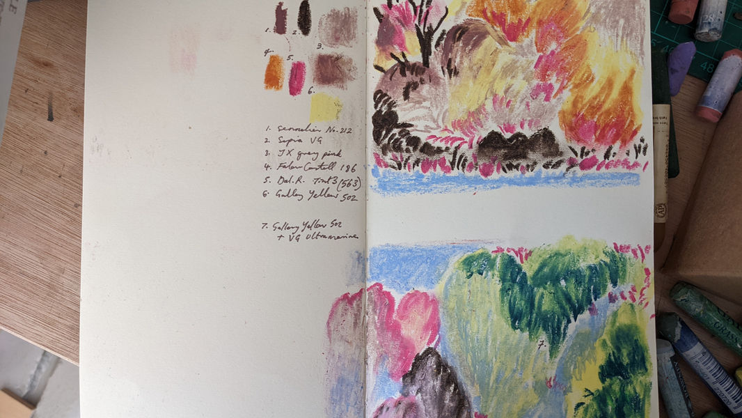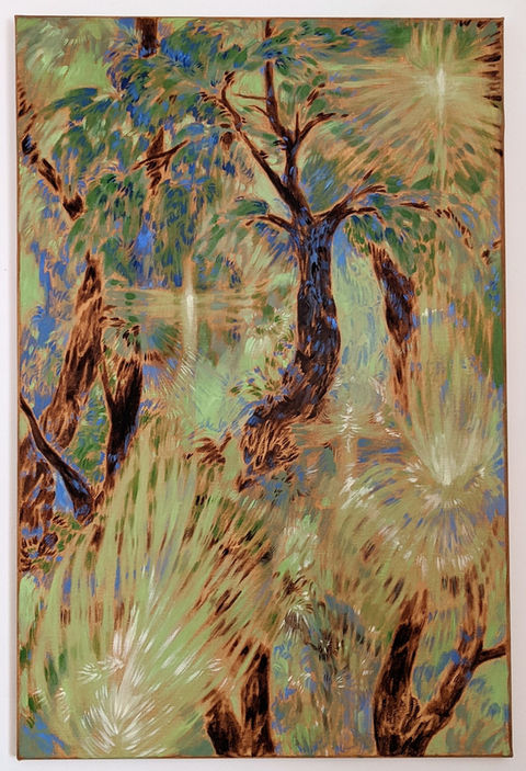 Suhaylah’s dreamscapes include both large- and small-scale observations of her own explorations of East Anglian terrain – from the medieval ruins at Bury St. Edmunds to swampy reservoirs, quiet lakes, mossy rocks, woven bird nests, labyrinthine roots and tapestries of vines. Such experiences and reflections are collected through drawings, photographs, and films which attempt to record something of the intangible mysteries of these places, alongside written notes on ideas about myth, religion and history that may inspire her artistic symbolism. Each dreamscape begins with Suhaylah’s production of a textural map of the larger structures in the composition, followed by painting the meditative or diaphanous features which she had previously been captivated by, such as a distorted reflection or a dancing plant. Suhaylah then intuitively builds the world of the painting through a deluge of details and gestures using a predetermined and highly experimental colour palette chosen in response to the ‘natural’ and ‘supernatural’ environments she wished to portray.